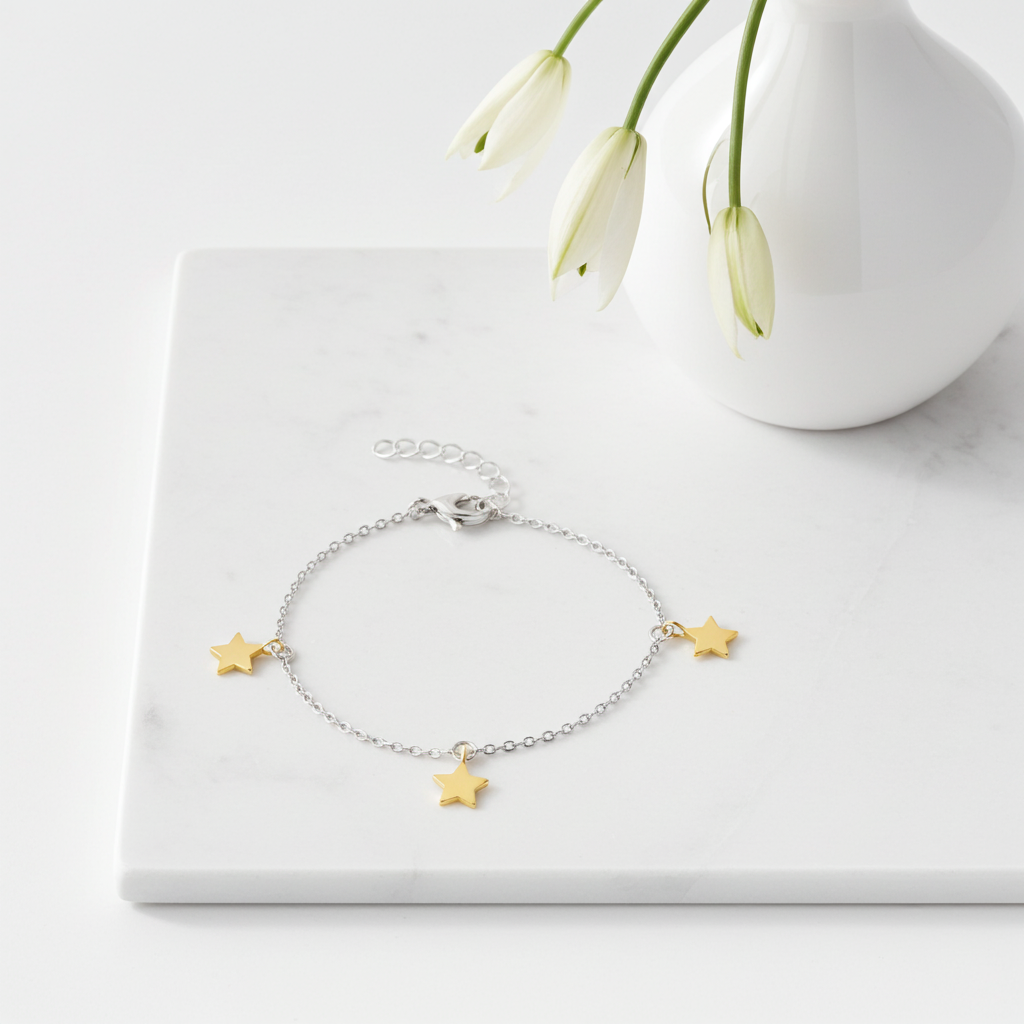 This 14k gold E Coat star bracelet is a stunning addition to any jewelry collection. Crafted with care, it features a delicate silver star chain that exudes elegance and charm.